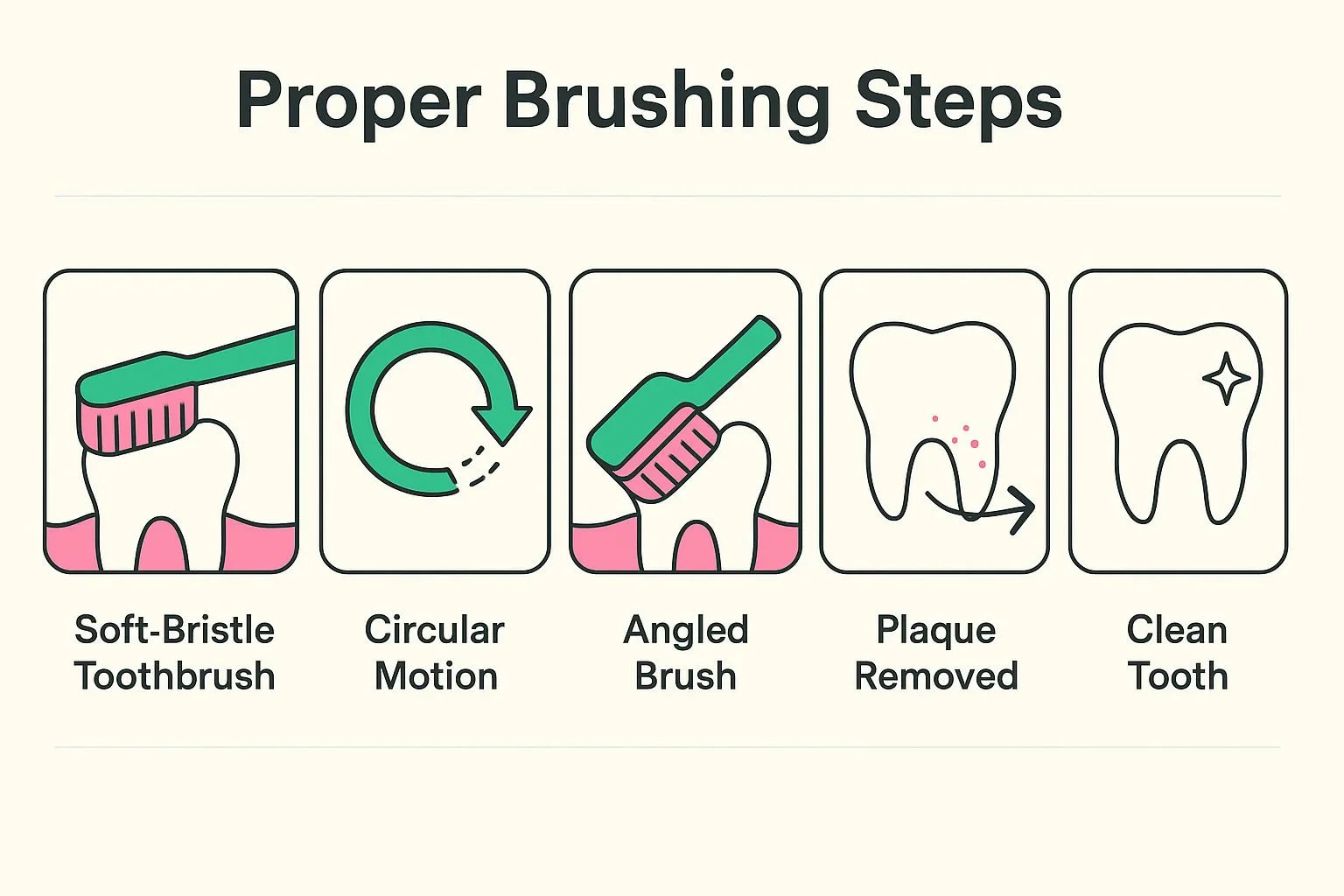 Step-by-step guide to proper brushing technique emphasizing gentle, effective plaque removal to protect gums.