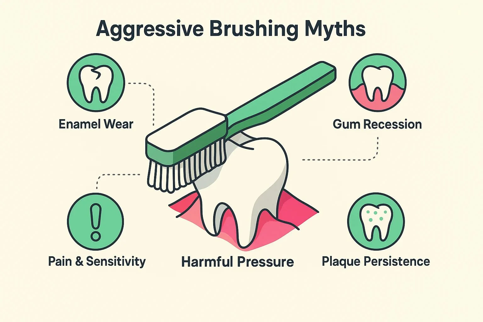 This visual debunks the myth that aggressive brushing cures gum disease by illustrating key damages caused such as enamel wear and gum recession.